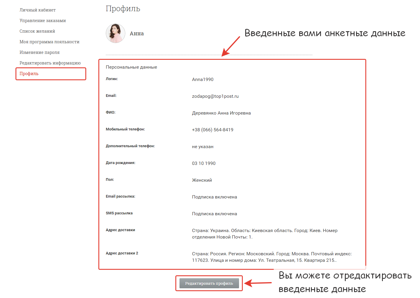 Завершив регистрацию, заполните все данные профиля, чтобы получить скидку 100 гривен, не вводить адрес доставки при каждой покупке, а также другие преимущества.
